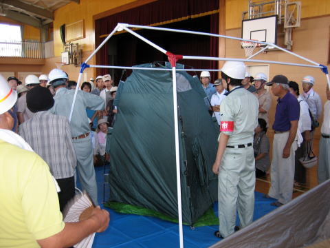 石田小学校内にて非常時の避難所の設置、や校庭地下の飲料水、プールでの水を飲料水に変える機器(実際には川の水や泥水を飲料水に変えることができるとのことでした)また、けが人の三角巾での応急処置、消防の貢川分団、国母分団の放水訓練、愛育連合会婦人部による炊き出し,甲府市役所職員による地域連絡員の災害時の避難所設置等などを各自治会の役割を踏まえ有事の防災訓練が行われました。